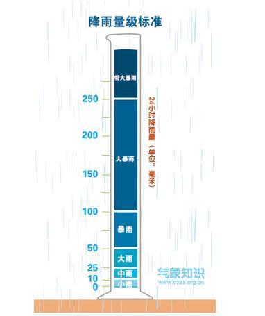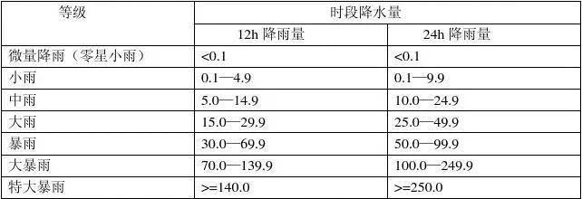 通常我们在天气预报中看到的小雨、中雨、大雨、暴雨等量级,就是用降水量来衡量的,具体标准如下: