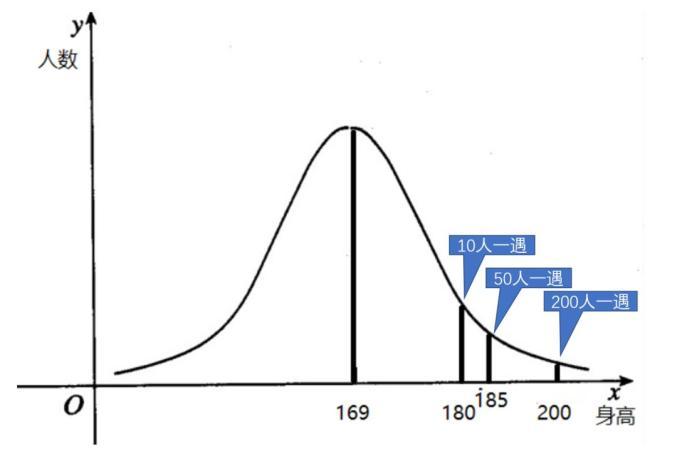 某中学高三学生的身高,用1班50人数据算得平均身高1.69米,最高者1.85米1人,最矮的1.60米,有5人身高高于1.8米。这个结果,用统计术语来表达就是:1.8米身高“10人一遇”,1.85米身高“50人一遇”,2米身高多少人一遇?我们根据已有数据可以拟合出一个能够大致反映全班身高的曲线,从这个曲线就可以推算出:2米身高大概需要200人一遇。比如下面这张图,虽然简陋,但是应该能看懂意思吧。