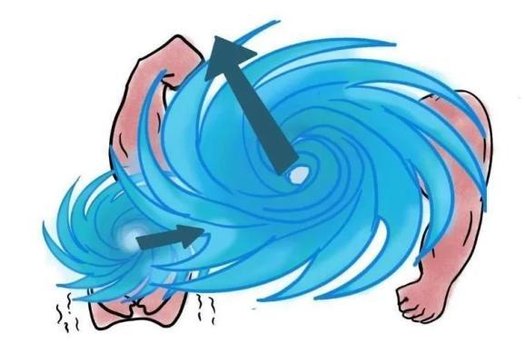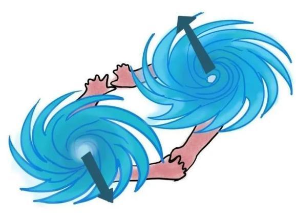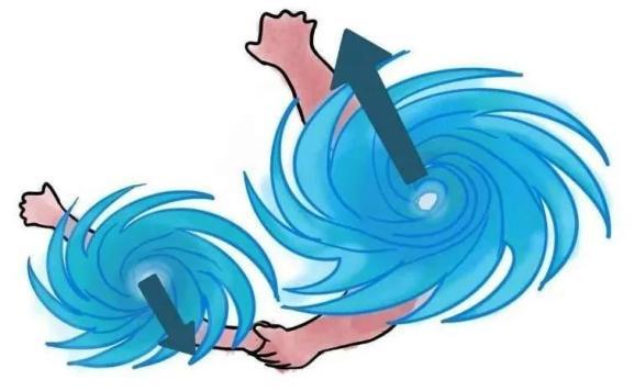 如果两个台风实力相当,它们就会绕着同一个中心沿逆时针方向共同转动,“携手向前”,这便是“相互影响型”。