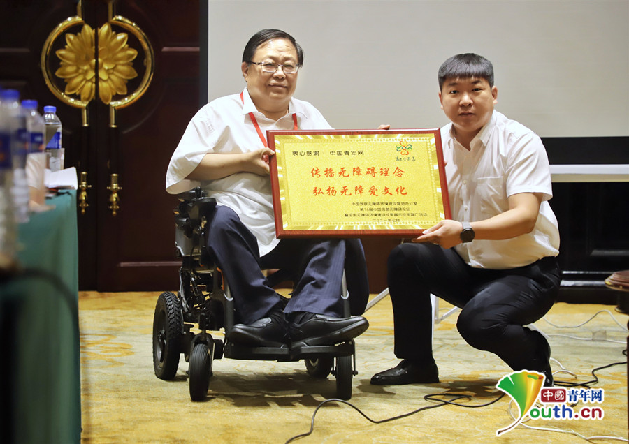 中国残联副主席吕世明(左)为中国青年网颁发了"传播无障碍理念"系列奖项。夏烯然 摄