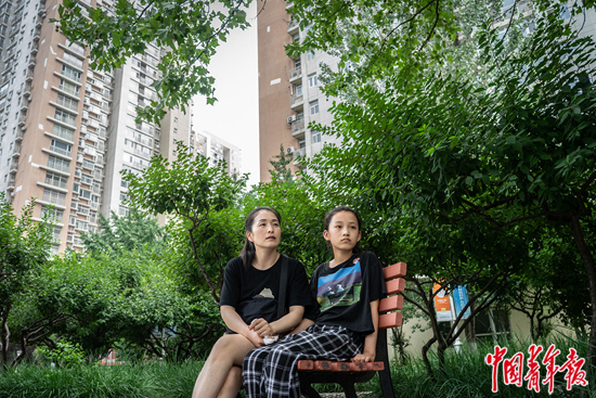 7月19日,北京市朝阳区,小芜和妈妈坐在妈妈雇主所在的小区内。这里紧邻北京东四环,附近写字楼、购物中心云集,小区内还有一所国际小学。小芜的妈妈是一位住家的家政人员,雇主家的女儿被她照顾了3年,也叫她“妈妈”。