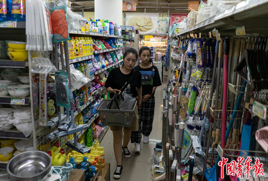 7月19日上午,北京市朝阳区,妈妈带小芜在小区超市里购物,这里是小芜的妈妈每天买菜的地方。逛超市时,母女俩一直抓着对方的手臂。
