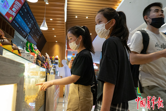 7月19日,北京市朝阳区,妈妈带小芜去电影院。虽然小芜是个擅长使用表情包的互联网“原住民”,但这是她第一次出远门、第一次来到大城市,也是第一次去电影院看电影。