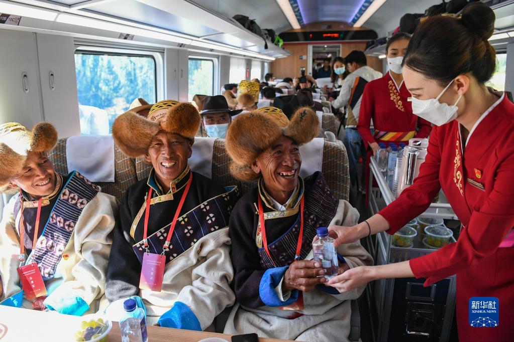 6月25日,全长435公里、设计时速160公里的拉林铁路建成通车,西藏首条电气化铁路建成,同时复兴号实现对31个省区市全覆盖。这是列车员向乘坐首趟复兴号高原内电双源动车组的乘客递水(6月25日摄)。新华社记者 普布扎西 摄
