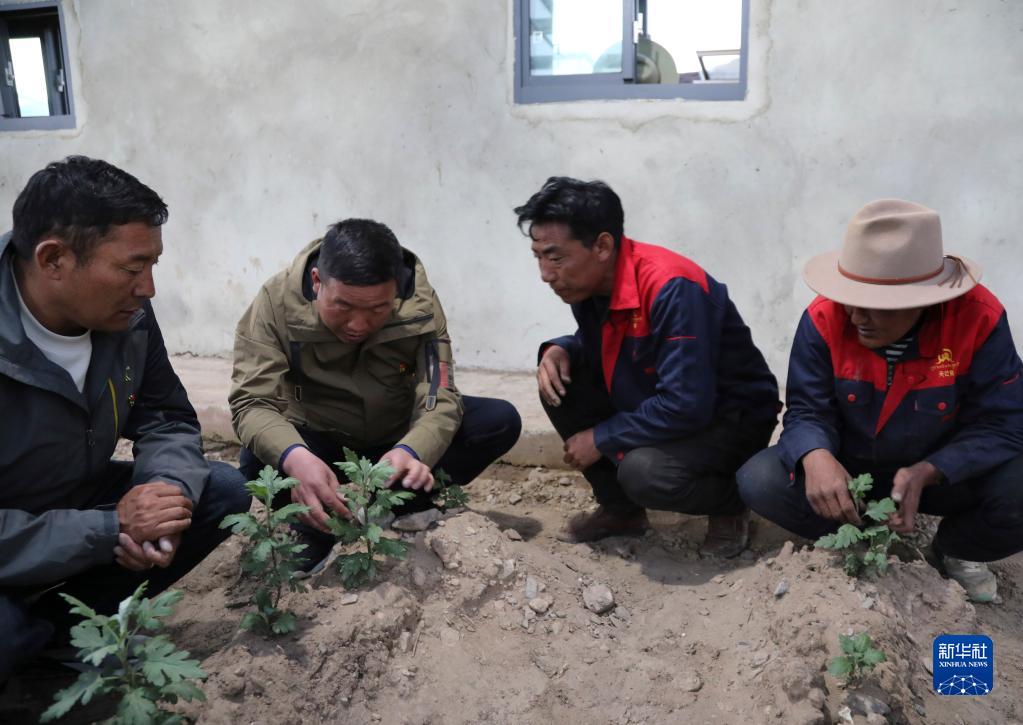西藏日喀则市岗巴县岗巴镇党委书记李明阳(左二)在贡菊大棚了解秧苗的培育情况(2019年4月15日摄)。新华社发