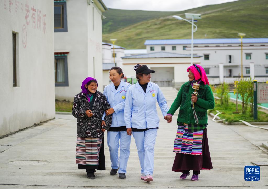 西藏山南市错那县特困人员集中供养服务中心的护理员在陪老人们散步聊天(2018年7月25日摄)。新华社发(刘东君 摄)