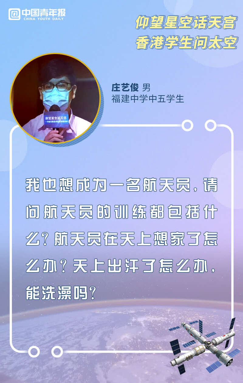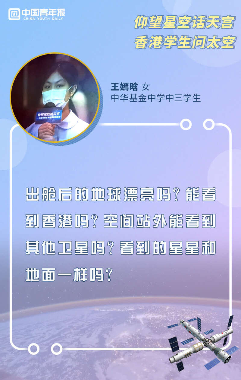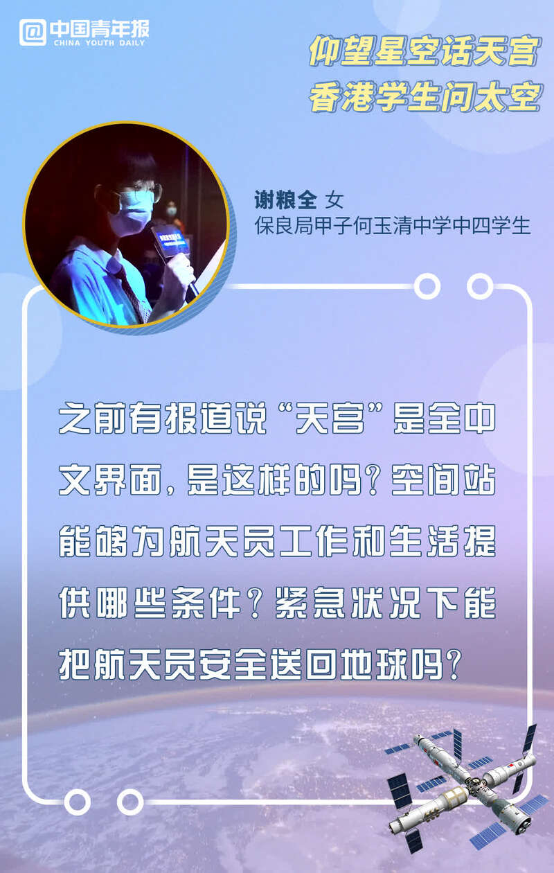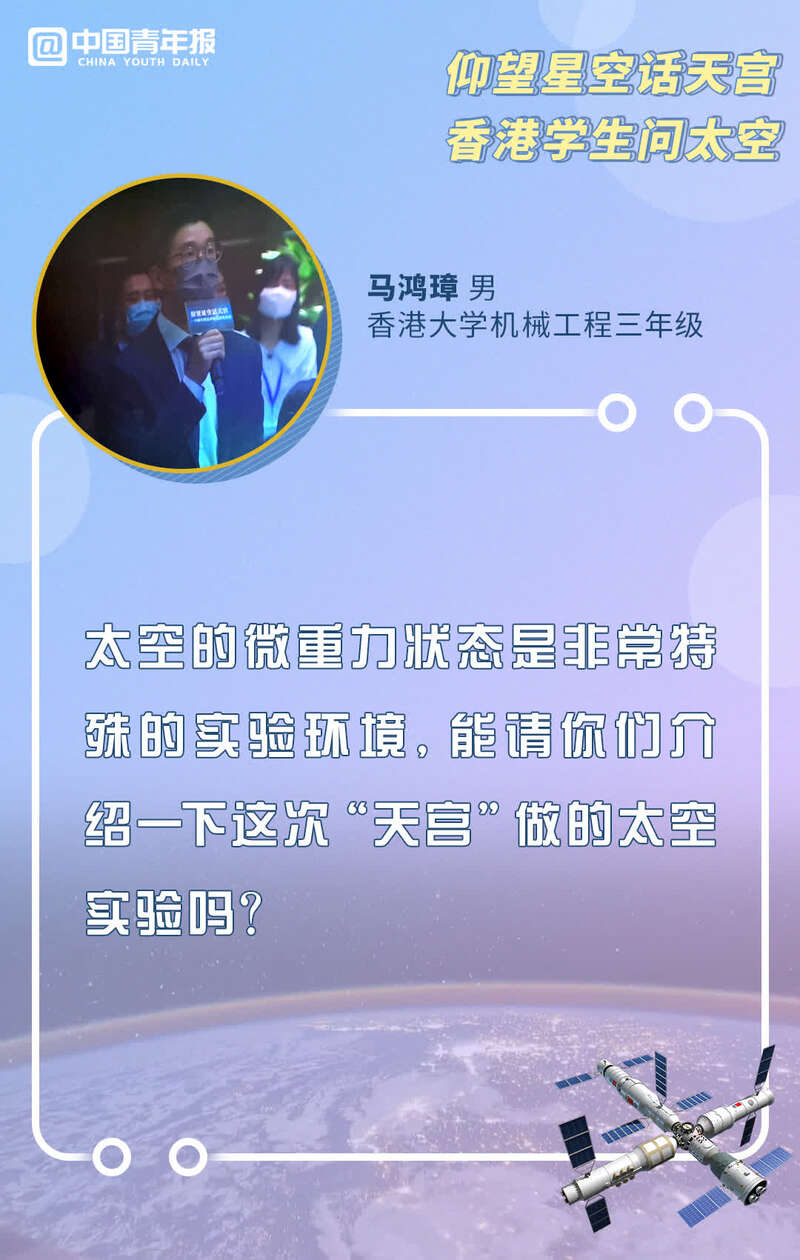 中国青年报客户端北京9月3日电(中青报·中青网记者 邱晨辉 美编 李晗) “香港呼叫神舟十二号!香港呼叫神舟十二号!”今天下午,“时代精神耀香江”之仰望星空话天宫活动在北京、香港两地联动登场。“太空出差三人组”神舟十二号航天员聂海胜、刘伯明和汤洪波,与近300名香港科技工作者、教师和大中学生,展开一场别开生面的天地连线互动。8位香港青年学生代表分别向北京航天专家和神舟十二号航天员进行现场连线提问,有关航天专家、航天员乘组对大家普遍关心的问题进行解答和同步在轨展示。