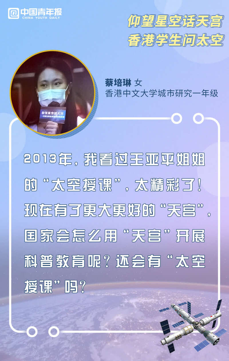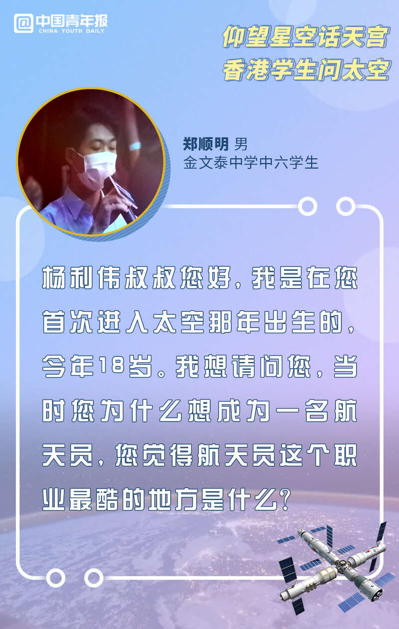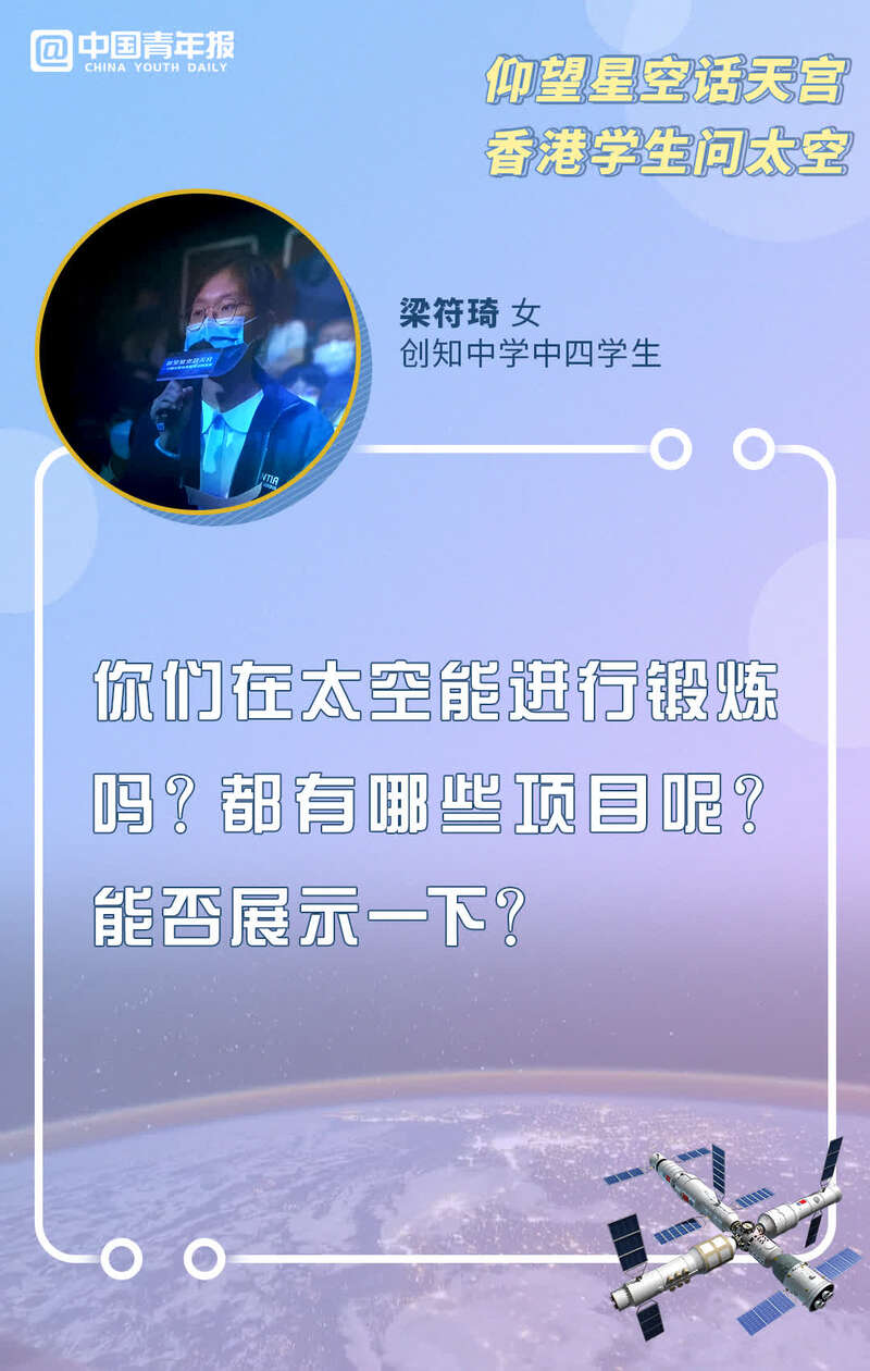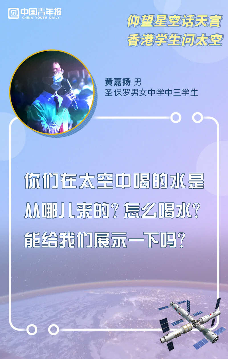 中国青年报客户端北京9月3日电(中青报·中青网记者 邱晨辉 美编 李晗) “香港呼叫神舟十二号!香港呼叫神舟十二号!”今天下午,“时代精神耀香江”之仰望星空话天宫活动在北京、香港两地联动登场。“太空出差三人组”神舟十二号航天员聂海胜、刘伯明和汤洪波,与近300名香港科技工作者、教师和大中学生,展开一场别开生面的天地连线互动。8位香港青年学生代表分别向北京航天专家和神舟十二号航天员进行现场连线提问,有关航天专家、航天员乘组对大家普遍关心的问题进行解答和同步在轨展示。