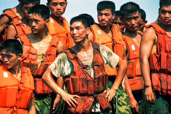 1998年8月9日,奋战在抗洪一线的解放军官兵。两天前,百年不遇的特大洪水致使江西长江主干道决堤30米,40余万九江市民的生命受到严重威胁。 贺延光/摄