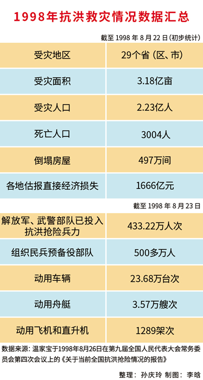 在1998年抗洪救灾中,还有很多这样的人。他们是写下“生死牌”、誓与大堤共存亡的驻守武汉市江汉区龙王庙闸口的16名共产党员,是由10余位山东沂蒙山农民自愿组成的突击队,是在大堤上为战士做了两万多碗免费拉面的面馆老板及其伙计,是舍小家、保大家的分洪区群众……正如时任总书记江泽民同志当年在全国抗洪抢险总结表彰大会上所说,“从白发苍苍的老人到系着红领巾的孩子,从工人、农民、知识分子到各级干部,12亿人民团结得像一个人”。