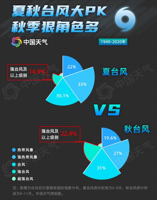 尽管夏季台风的生成和登陆数量都是一年中最多的,然而气象大数据显示,秋台风更容易出“狠角色”。1949年至2020年间,秋季生成的台风中,超强台风占比27.9%,远高于夏季的18%。