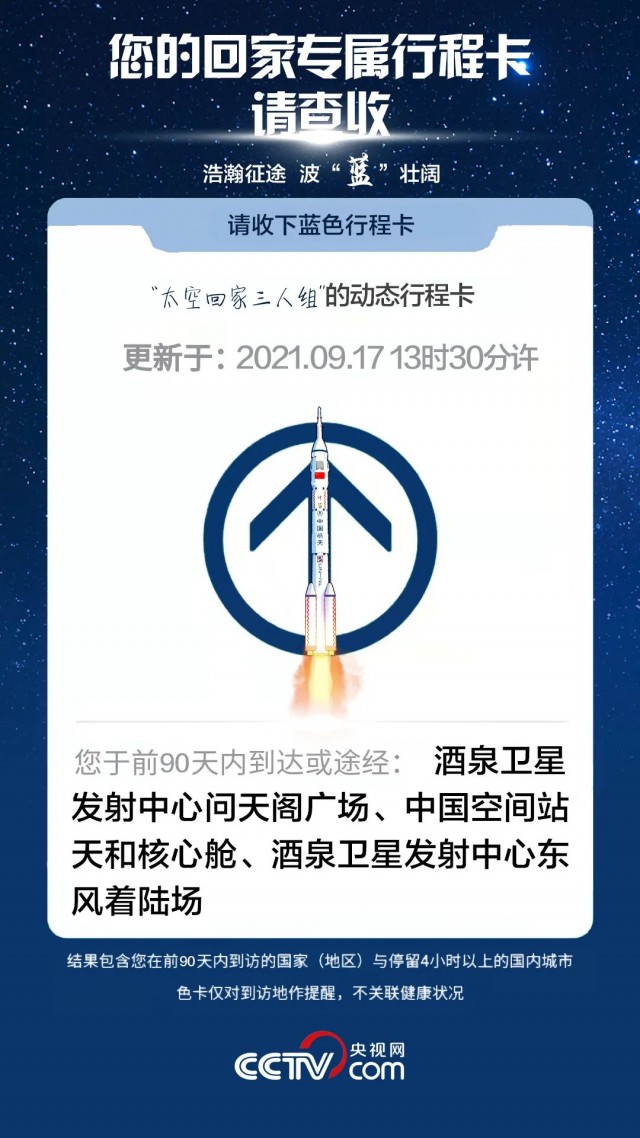 不过,虽然人手一张“太空限定行程卡”,航天员返程后仍需隔离。落地后,他们需参照三级隔离制度进行隔离。
