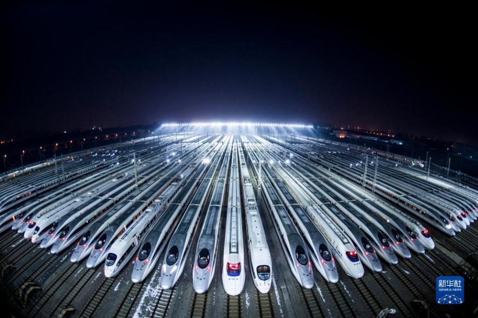 动车组停靠在武汉动车段的存车线上,准备进行检修和保温作业(2018年2月1日摄)。新华社记者 肖艺九 摄