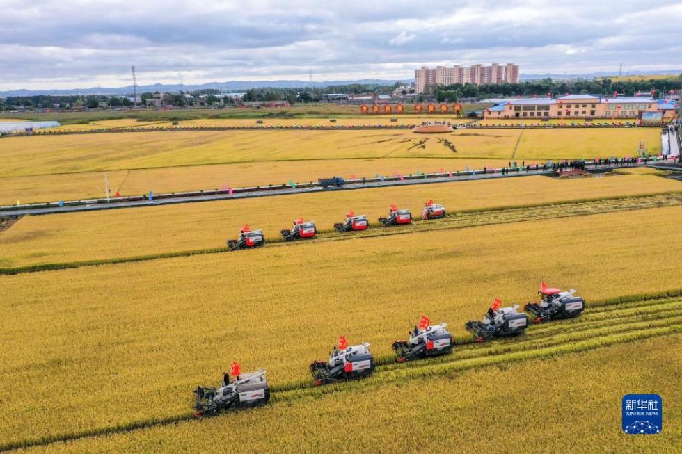 在吉林省长春市九台区龙嘉街道红光村,农民驾驶农机进行水稻收割作业(9月23日摄,无人机照片)。新华社记者 张楠 摄