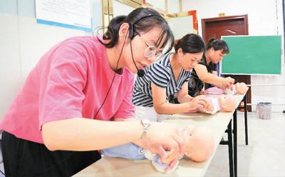 10月7日,在江西省抚州市金溪县一家职业技能培训学校,当地妇女正在参加母婴护理培训。