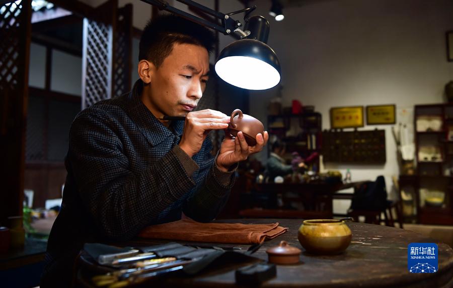 10月22日,吕继成在工作室整理摆放陶壶作品。新华社记者王全超摄