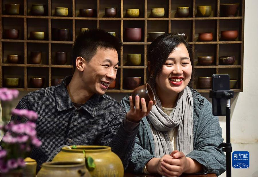 10月22日,吕继成和妻子王春燕通过快手等直播平台推介荣昌陶。新华社记者王全超摄
