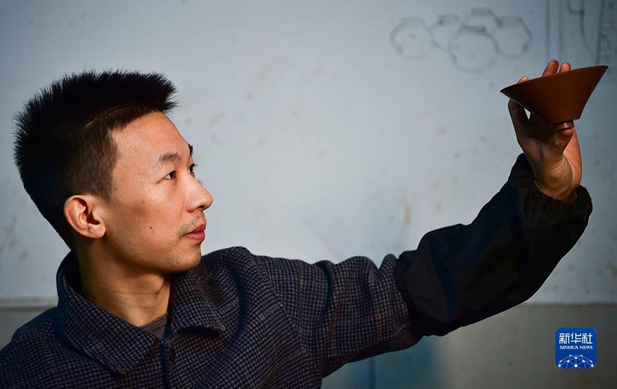 10月22日,吕继成在制作陶器过程中观察调整茶盏外形。新华社记者王全超摄