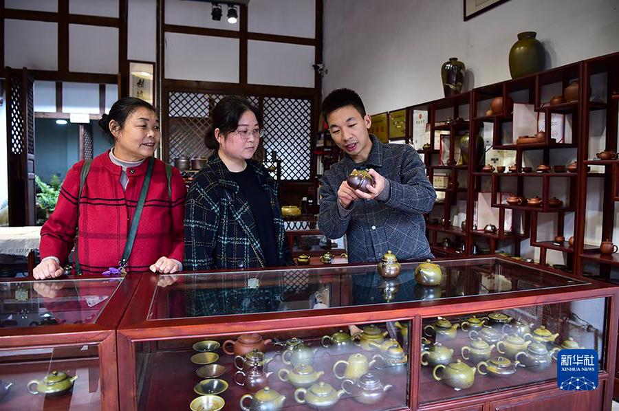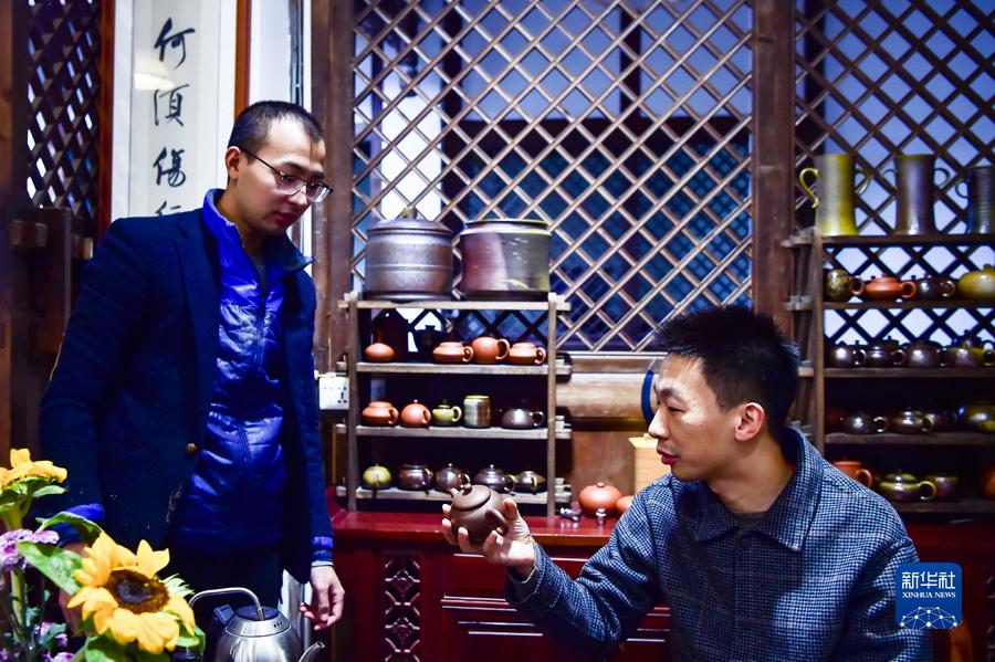 10月22日,吕继成(右一)在向前来工作室参观的游客介绍陶壶作品。新华社记者王全超摄