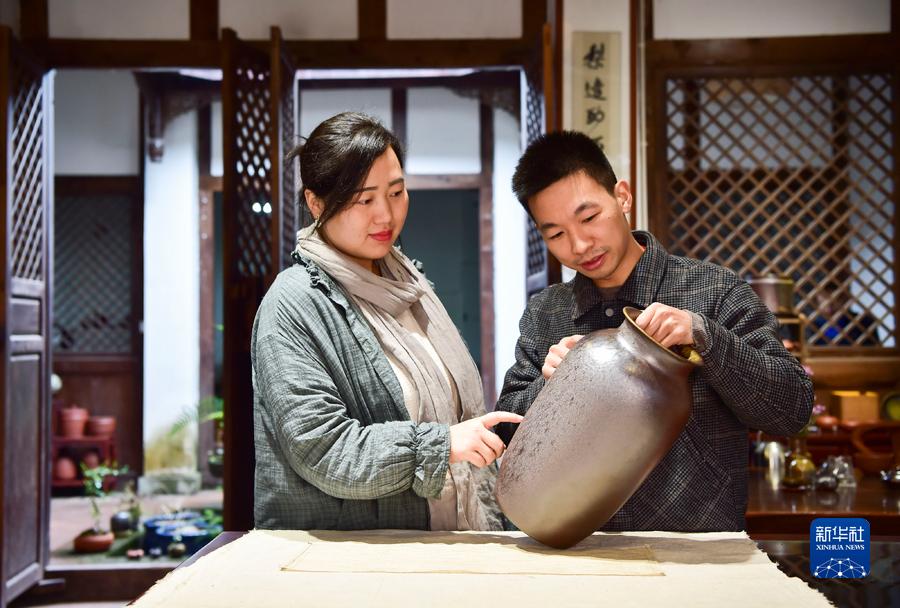 10月22日,吕继成和妻子王春燕在交流陶器设计与制作。新华社记者王全超摄