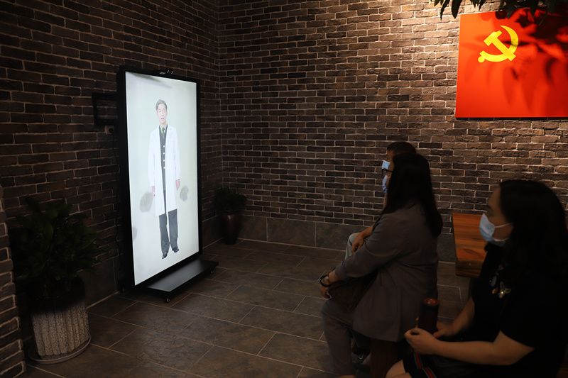 泉州市党内政治生活体验馆内,观众体验“时光之镜”项目,与全军挂像英模林俊德“对话”。