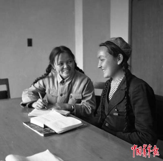 1958年,中国青年报记者夏小雨(左)采访先进人物。