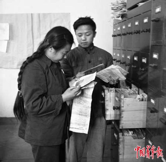 1953年4月,中国青年报社读者来件部的石仲华(左)、孙仲达(右)在认真处理读者来稿。