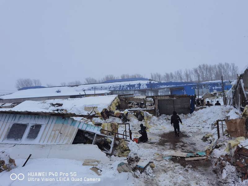受新冠肺炎疫情、市场多种因素影响,宫旭光的养猪场今年本来就处于亏损状态,这场大雪让他损失加剧。他说,往年光景好的时候,一年收益能有100多万元。这两天,他组织员工积极自救,维修塌陷棚舍,以防造成更大面积的坍塌。