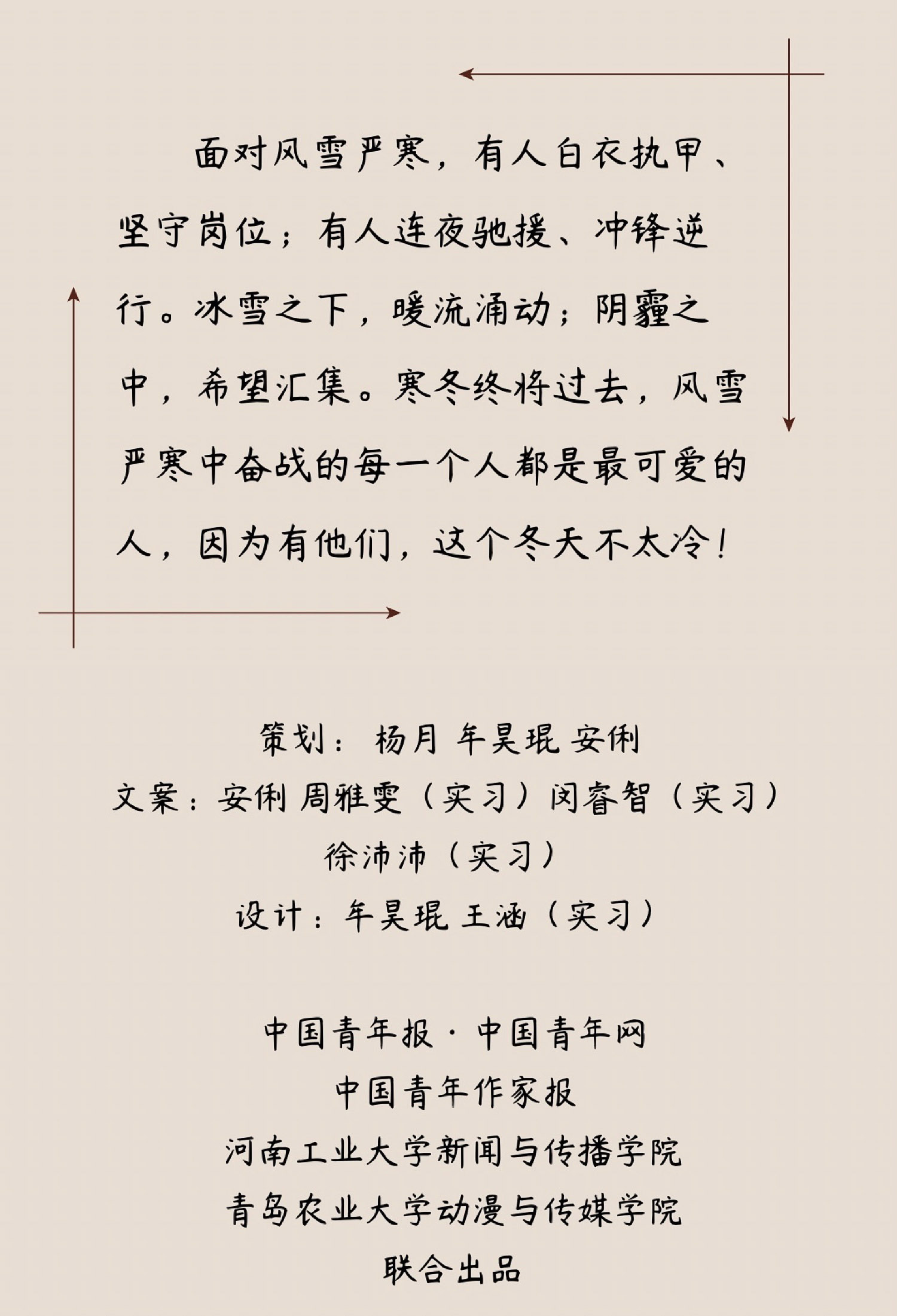 “忽如一夜春风来,千树万树梨花开”。漫天飞雪,动人景致的背后是一场紧张有序的“城市保卫战”。风雪中,一群可爱的人坚守在自己工作岗位上,他们是医护人员、是消防员、是交警、是小区门口的保安,是一个个平凡又温暖的人。他们的守护,温暖了寒冬。