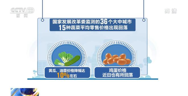 目前,国家发展改革委监测的36个大中城市15种蔬菜平均零售价格出现回落,其中黄瓜、油菜价格降幅达10%左右,同时,鸡蛋价格近日也有所回落。