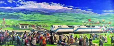 在青藏铁路题材油画作品《心飞彩虹》中,三位身着民族传统服饰的藏族妇女漫步向前,她们的身后,一条鲜亮的彩虹横亘半个天空。这条彩虹就是青藏铁路,它给雪域高原带来了勃勃生机,它为高原各族人民架起了与全国各地交流交通的希望之桥。