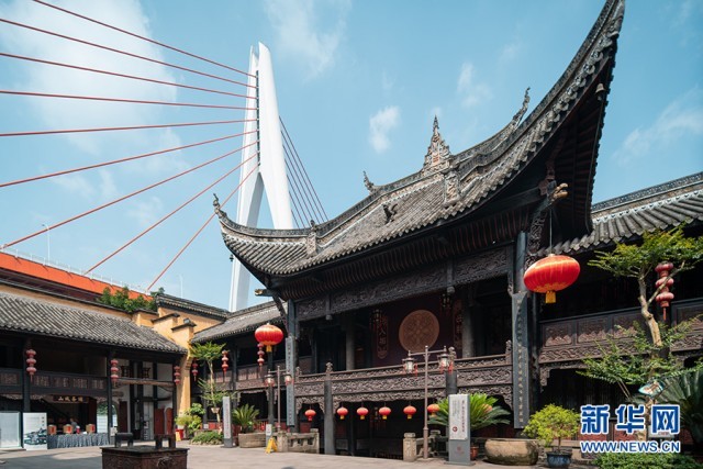 古老的湖广会馆与现代的东水门长江大桥交相辉映。资料图片。新华网 耿骏宇 摄