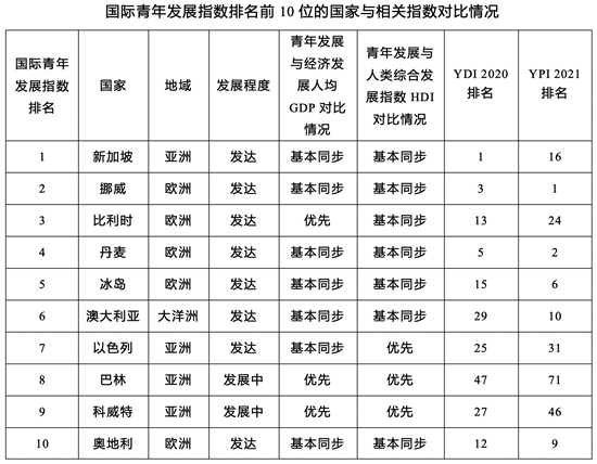 青年进步指数(YPI)是欧洲青年论坛委托社会进步促进会开展的研究,分析框架基于该促进会2013年发布并逐年更新的社会进步指数。第一版YPI指数发布于2018年,2021年进行了更新。与YDI指数相同,由于指标选择和数据来源的修订,不同版本的YPI指数之间无法进行比较。YPI 2021主要围绕基本人类需求、幸福基础、发展机会3个维度确定12个发展领域,每个领域设置3-5项指标,共设置58项具体指标。该指数以15-24岁青年作为研究对象,数据来源包括联合国粮农组织、毒品与犯罪办公室、教科文组织、开发计划署、经社事务部以及世界银行、世界卫生组织、国际劳工组织、国际电信联盟等国际组织的统计数据,全球疾病负担数据库、盖洛普世界民意调查、民主多样性项目等研究咨询机构的调查数据,以及泰晤士高等教育排名等测算数据。经过原始数据缺失值插补、主成分分析赋权等方式合成12个领域的标准化得分,通过等权重的方式合成3个维度得分以及总体得分。YPI 2021测算出150个国家和地区的完整青年进步分数,对18个国家进行了部分测算。YPI 2021排名前10位的国家依次是挪威、丹麦、芬兰、瑞士、瑞典、冰岛、新西兰、加拿大、奥地利、澳大利亚,其中有7个欧洲国家、两个大洋洲国家、1个北美洲国家。亚洲排名最高的是新加坡,仅排名第十六位。