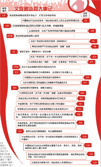 8月27日,中央网信办发布《关于进一步加强“饭圈”乱象治理的通知》,明确10条措施,平台榜单、经纪公司、网络综艺被纳入整治范围;9月2日,中宣部印发《关于开展文娱领域综合治理工作的通知》,禁止劣迹艺人转移阵地复出,并把整治范围扩大到整个演艺娱乐行业,具体的整治措施从9月下旬开始快速实施。