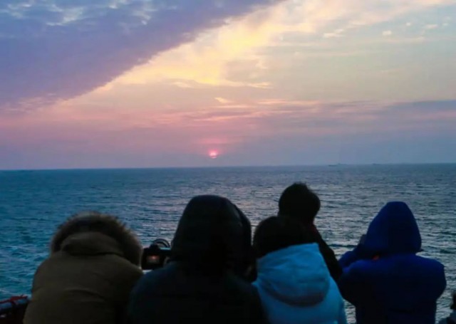 2022年1月1日,游客们来到山东威海成山头,迎接新年第一缕日出,放飞新年心愿。从文考 摄