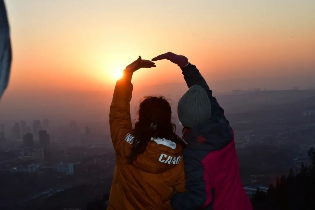 2022年的第一天清晨,在山西阳泉狮脑山的观景平台上,市民们纷纷拿出相机、手机,记录下新年的第一缕阳光。新华网发 晋向华 摄