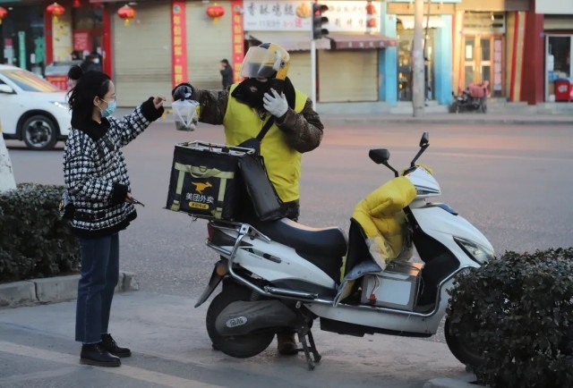 2022年1月1日,在甘肃省平凉市崆峒区中心城区街道,一名外卖小哥给市民送早餐。新华网发 吴希会 摄