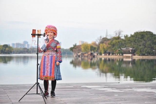 2022新年第一天,在浙江省嘉兴市南湖边,在嘉兴务工的苗族小许开了自己的首次直播。嘉兴日报 田建明 摄