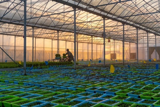 2022年1月1日,安徽省合肥市庐阳区大杨镇岗西村有机盆菜大棚,工人们沐浴着2022年第一缕阳光,忙着采收菜、运菜。阮雪枫 摄