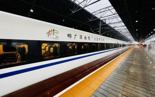 今天早上7:33,郴广深快线·大美仰天湖号专列从郴州高铁西站新年首发,驶向粤港澳大湾区。新华网发 田雪剑 摄