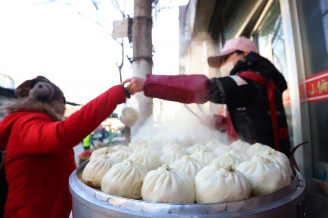 1月1日,在甘肃省平凉市崆峒区南山早市上,市民正在购买热气腾腾的包子。新华网发 吴希会 摄
