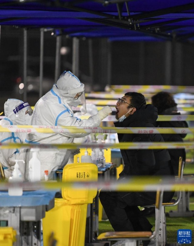 1月10日凌晨,在天津市南开区鼓楼街道中营小学核酸检测点,医护人员为市民做核酸采样。新华社记者 孙凡越 摄