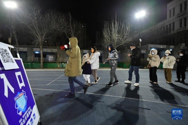 1月9日晚,天津市南开区鼓楼街道中营小学核酸检测点正在检测。新华社记者 赵子硕 摄