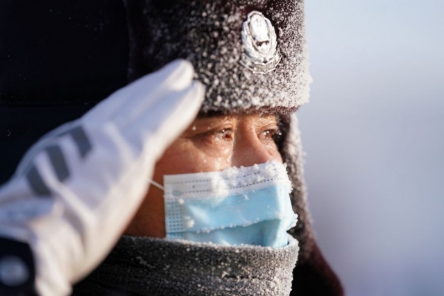 ↑黑龙江省大兴安岭地区呼中区公安局交警孙臣的眼睫毛和帽子都上了霜(2021年1月8日摄)。