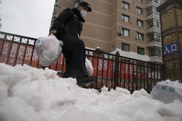 ↑在黑龙江省哈尔滨市平房区一处小区,卡点执勤民警帮助运送生活物资(2021年11月8日摄)。