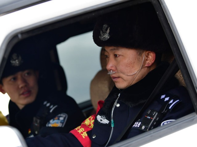 ↑青海海西蒙古族藏族自治州格尔木市的青藏铁路公安局格尔木公安处沱沱河站派出所副所长蒲海春(右)在巡线途中出现高原反应后紧急吸氧(2021年2月5日摄)。