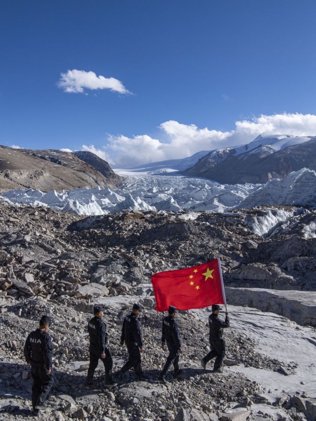 ↑西藏山南市浪卡子县普玛江塘边境派出所的移民管理警察在巡逻途中(2021年11月20日摄)。