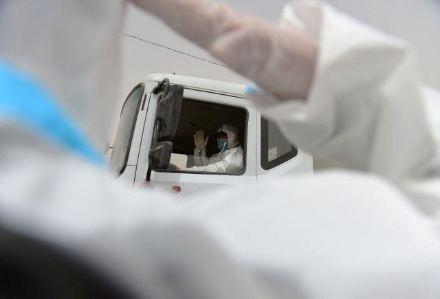 ↑在新疆喀什地区塔什库尔干塔吉克自治县的卡拉苏出入境边防检查站,货车司机向执勤一队女民警孙雪挥手致意(2021年5月5日摄)。
