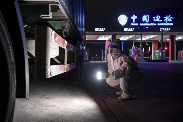 ↑广西东兴出入境边防检查站民警在检查停在东兴口岸限定区域内的货车(2021年12月30日摄)。