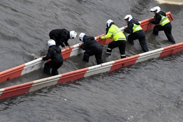 ↑ 交通警察在河南省郑州市花园路冒雨修复交通设施。(2021年7月20日摄)。